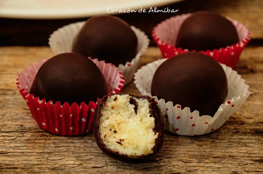 Con éstos bombones se rendirán a tus piés....estoy segura, en casa duran un asalto, el contraste crujiente del chocolate y la melosidad de la mezcla de leche condensada y coco, es absolutamente irresistible....y además muy fáciles de hacer, te atreves?????